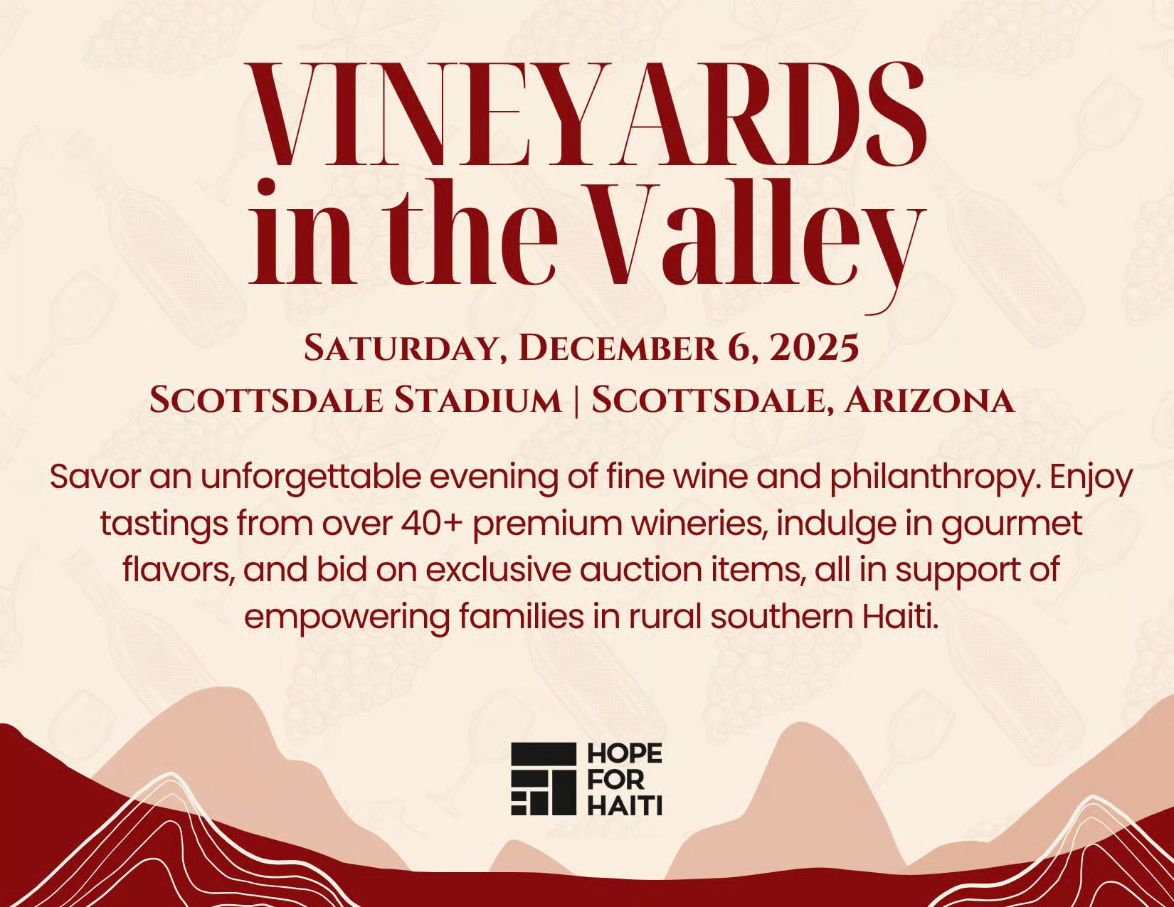 Vineyards in the Valley is back for its second year at Scottsdale Stadium on Saturday, December 6, and this wine tasting event supports Hope for Haiti's healthcare initiatives in rural Haiti. We're talking breast and cervical cancer screenings, nutrition support for mothers, and life-saving medications for families who need them most.